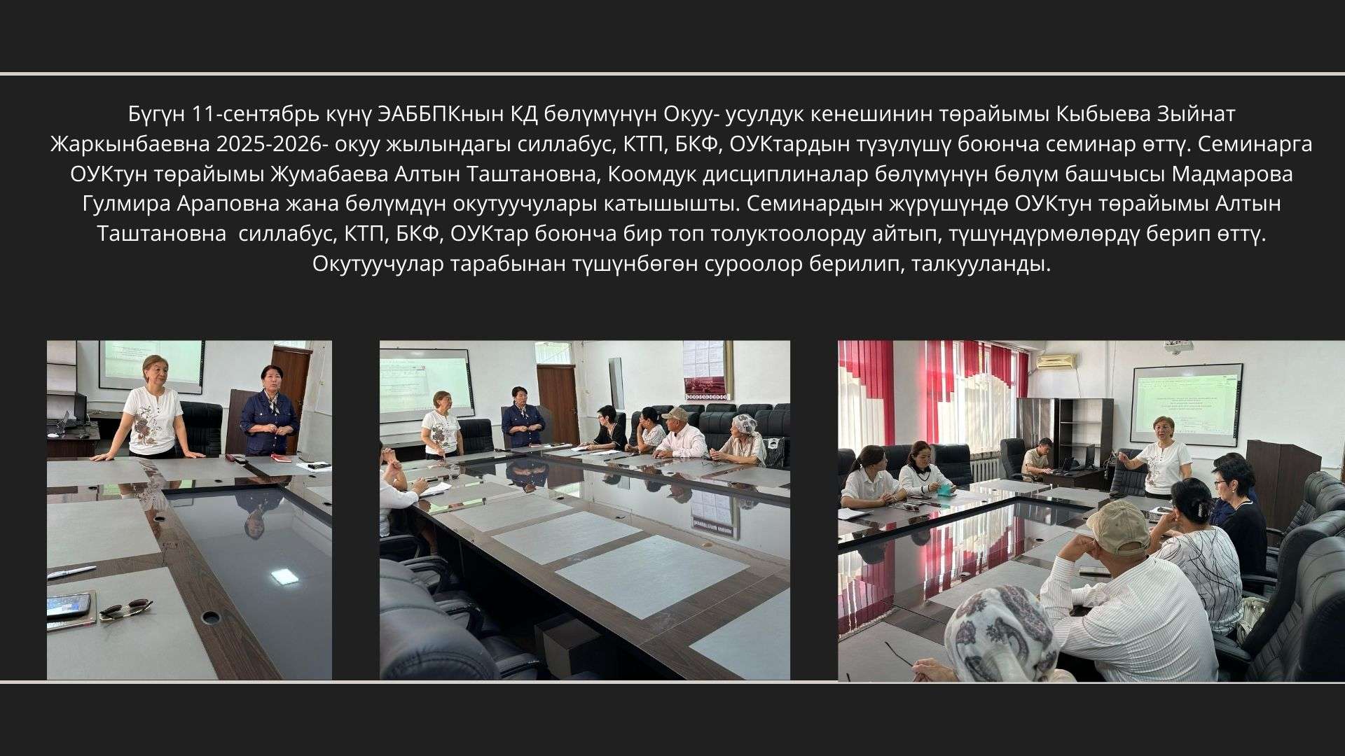 3 июнь преподаватель КМОПа Кулушева Айбарчын Токтомаматовна качестве гостя на телепрограмму «Коз Карас» Национальной телерадиокомпании ЭлТР в Оше. В программе обсуждались актуальные проблемы общества, насилие и семейные конфликты, их причины и пути решения.