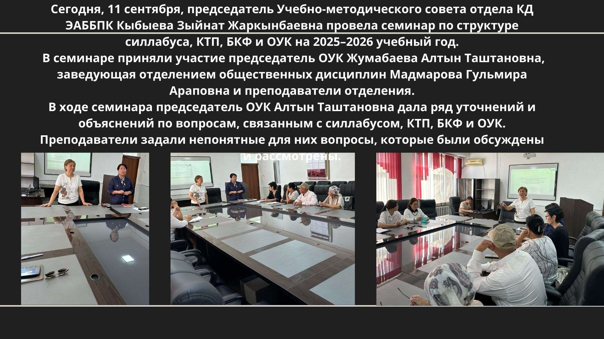 Для студентов 1-го курса Финансово-юридического колледжа был организован семинар под названием "Начало нравственности — приветствие". Семинар был проведен преподавателем А. Айтманбетовым на высоком уровне.