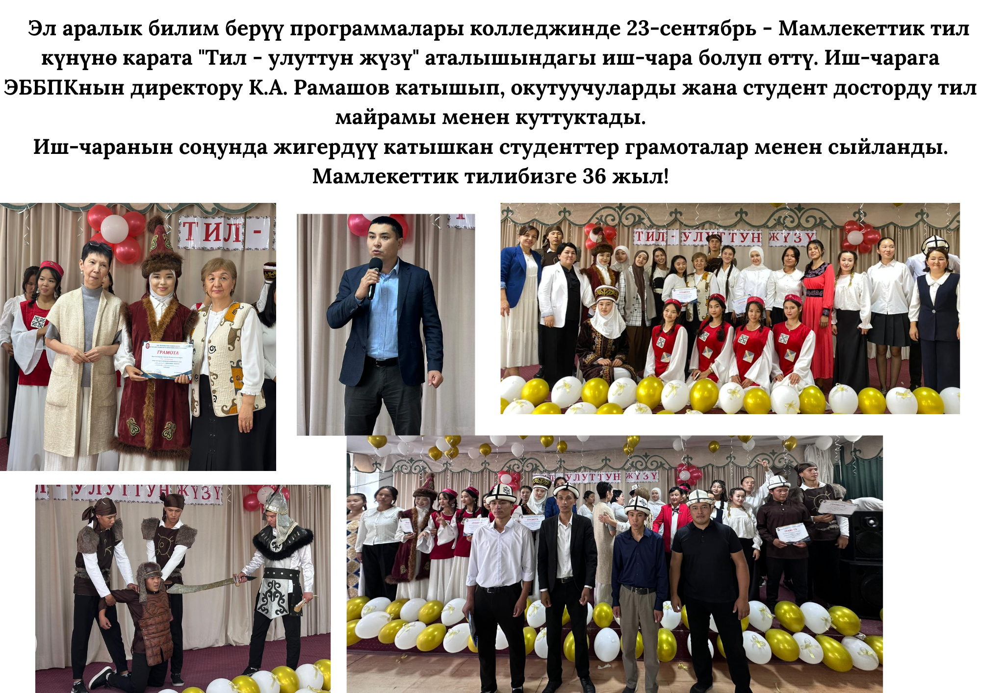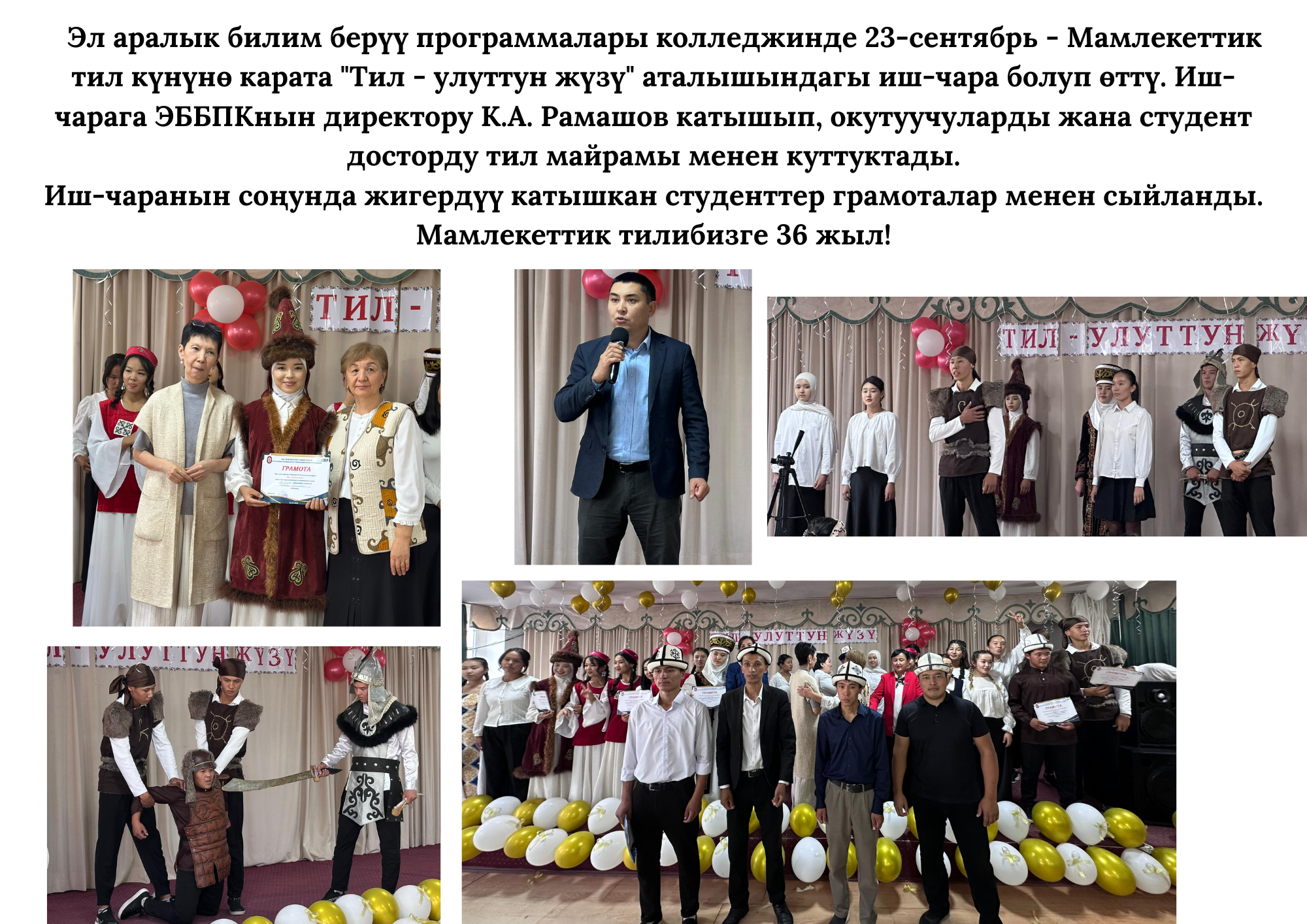 Мероприятие открыла заведующая кафедрой гуминовой педагогики Индустриально-педагогического колледжа, доцент Анарбаева Г.А., которая выразила благодарность за талант талантливых студентов. Студентам, принявшим активное участие, были вручены благодарственные письма. Также хотим выразить благодарность Ажиматове Нурзат, которая отвечает за воспитательную работу.