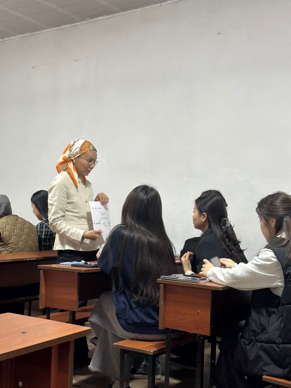 On February 7, 2025, the instructor of the Department of Foreign Languages, Nematzhan kyzy Bubuaisha, conducted demo lesson on the topic "Contrast: Past Simple and Present Perfect" for the students of group Ays 2-23 (3rd stream, Kyrgyz). During the lesson, the teacher paid attention to each student, and the students actively participated in the class, which contributed to the achievement of the lesson′s objectives. However, it was suggested to include examples from real life to make the lesson more interesting. This suggestion could increase student engagement and help them better grasp the material by linking the grammatical topics to everyday experiences.